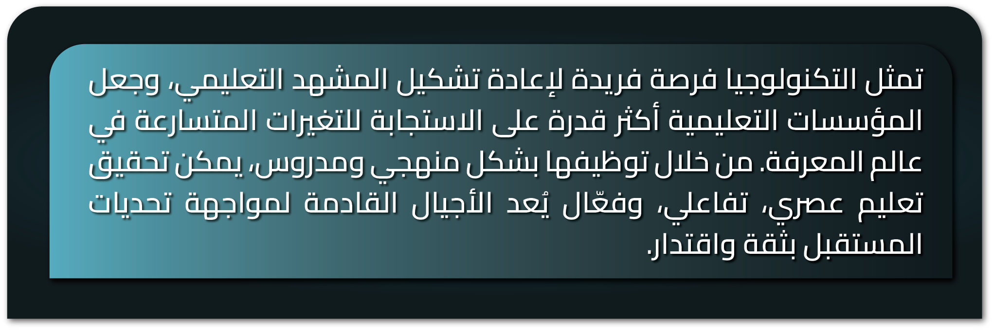 من خلال الفصول الافتراضية، أنظمة إدارة التعلم، والسبورات الذكية، بات بإمكان المؤسسات التعليمية تقديم تجربة تعليمية غير مرتبطة بزمان أو مكان، تعتمد على التفاعل والتخصيص بدلًا من التلقين والنمطية.